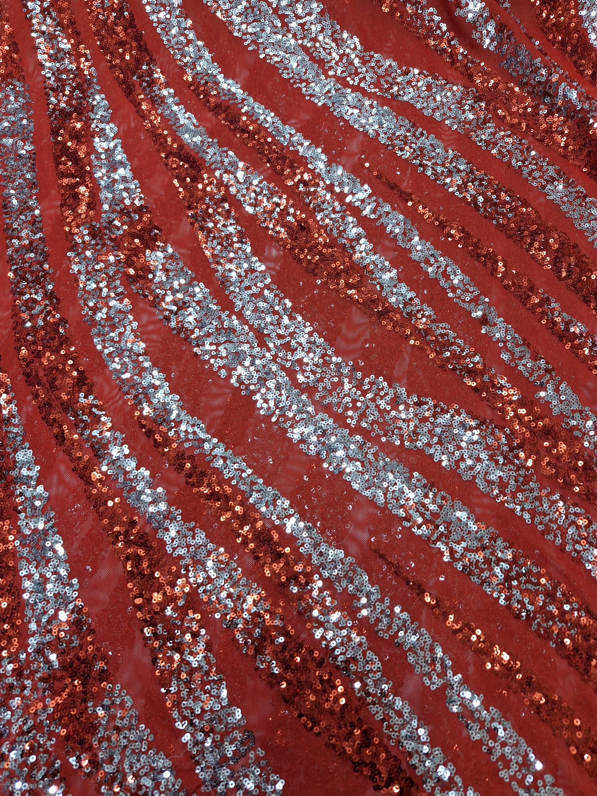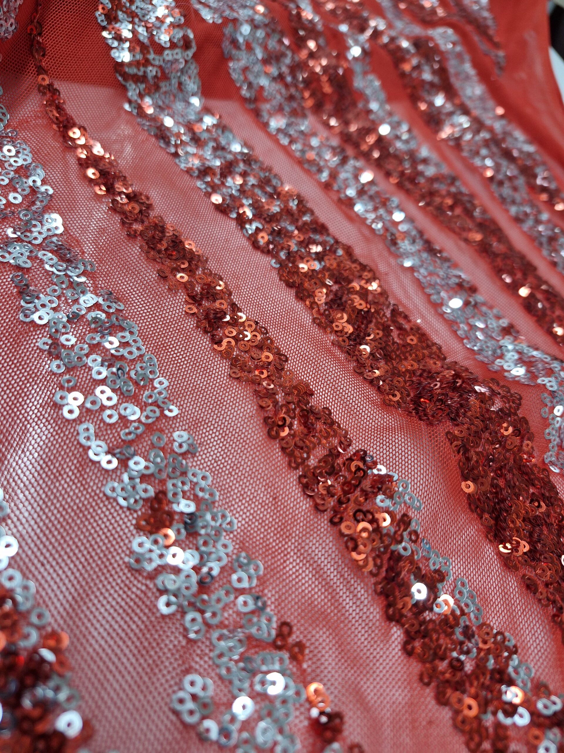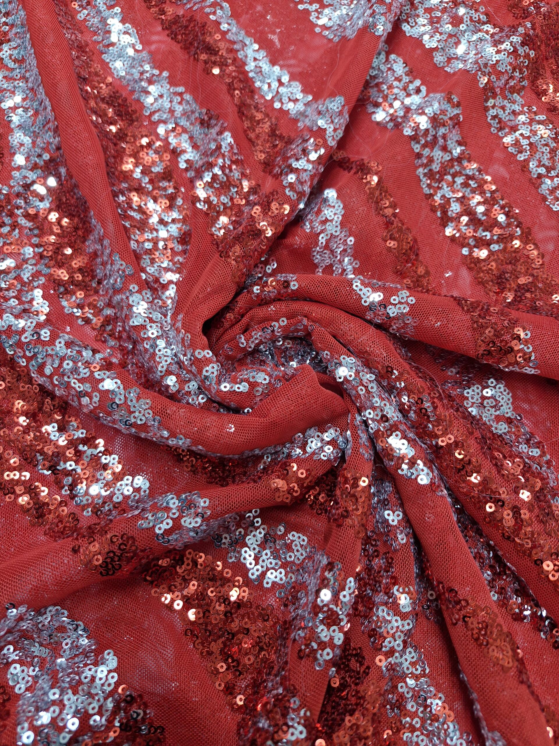 Özellikler: Tül zemin, kırmızı ve gümüş payetli dalga desen, ışıltılı yüzey, akışkan görünüm